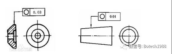 圓度是限制實際圓對理想圓變動量的一項指標,其公差帶是以公差值t為半徑差的兩同心圓之間的區域。圓度公差屬于形狀公差,圓度誤差值不大于相應的公差值,則認為合格,下圖為圓度公差標注圖: