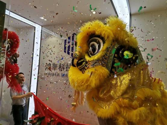 上午9時,鴻華科技有限公司喬遷慶典布置內(nèi)容已全部就緒,公司全體同事著裝公司文化衫,熱情迎接出席公司喬遷慶典活動的各位嘉賓。上午10時18分,公司喬遷慶典儀式正式開始,首先是公司邀請的舞獅隊在寫字樓大樓戶外活動慶典場地上進(jìn)行舞獅表演;上午10時50分,戶外舞獅表演結(jié)束,嘉賓、公司同事和舞獅隊隊員合影留念,隨后全部人員前往公司辦公室。