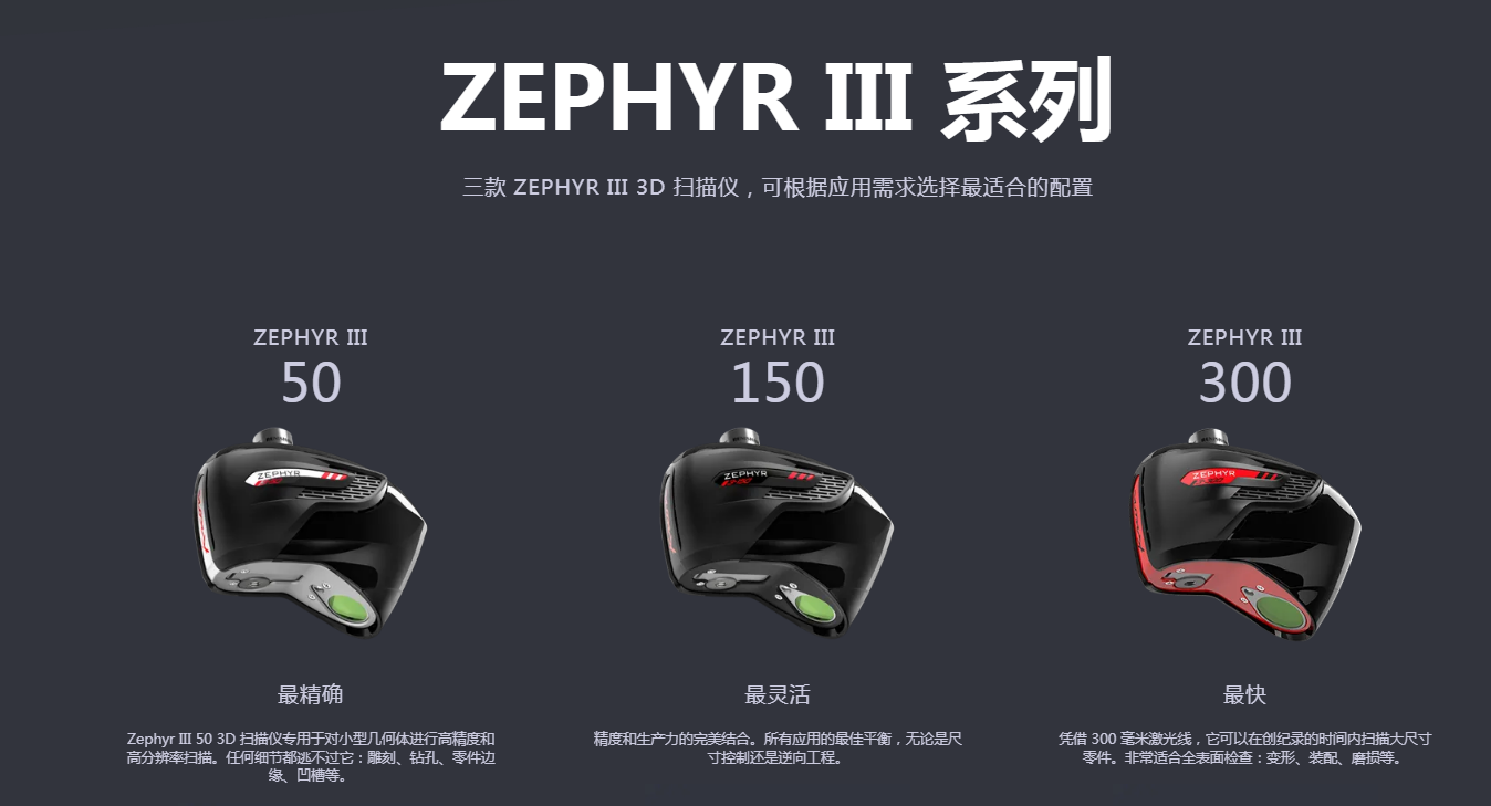 Zephyr III 高端掃描儀搭配150mm或50mm激光線,能在數(shù)秒間輕松掃描復(fù)雜物體。藍(lán)色激光線可直接掃描黑色或光澤表面。作為通用產(chǎn)品,它們滿足CMM所有測(cè)量需求,并且可以在測(cè)量臂、機(jī)器人、機(jī)床和光學(xué)跟蹤儀上靈活切換。