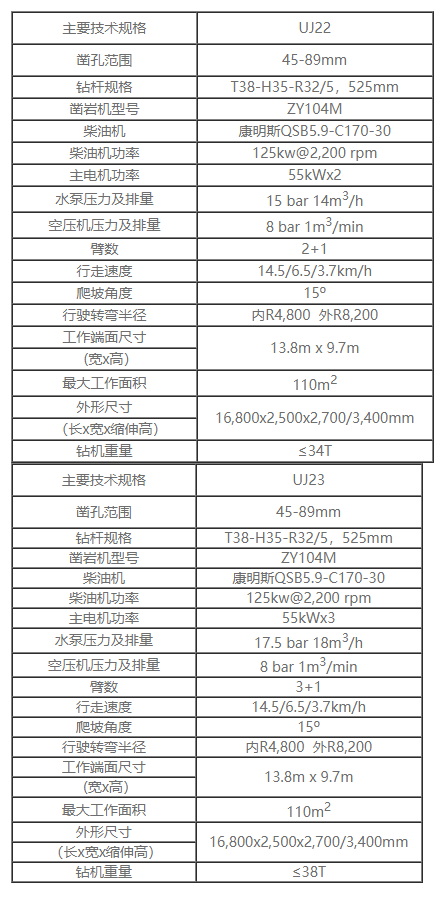 UJ22/UJ23鉆機適用于公路、鐵路、水電等中型隧道掘進、錨桿施工,并配有重型鉆臂和一個服務臺,全方位,高標準配置以滿足客戶不同需求。